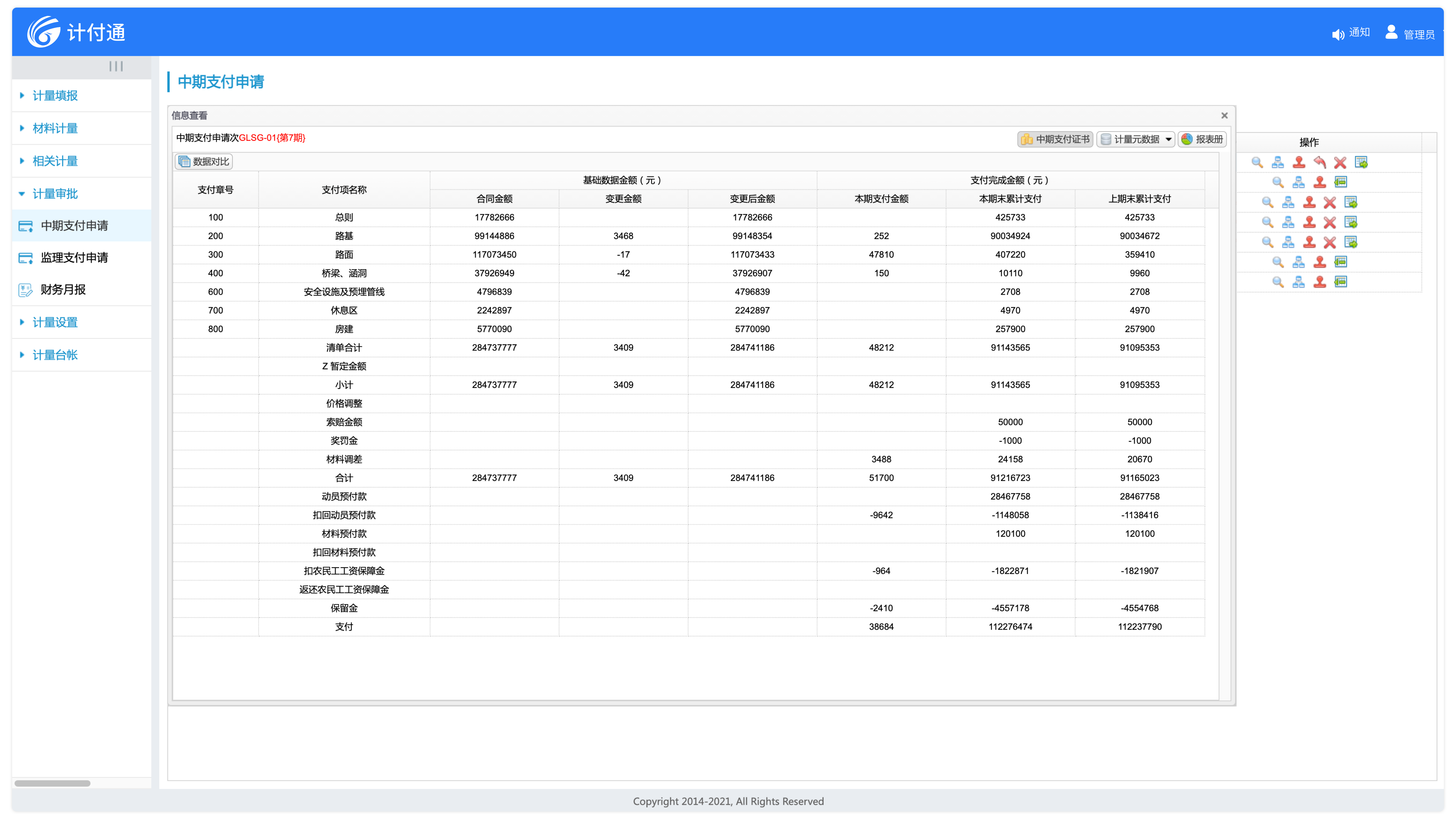 程留痕、報(bào)表完整、超計(jì)預(yù)警等,實(shí)現(xiàn)了計(jì)量支付業(yè)務(wù)的標(biāo)準(zhǔn)化和規(guī)范化。